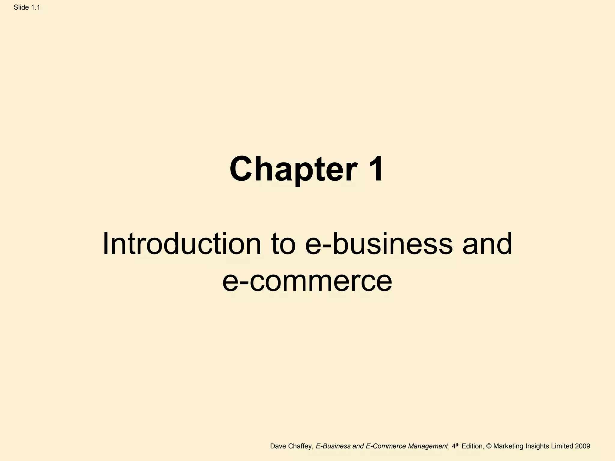 This document provides an introduction to e-business and e-commerce. It defines key terms like e-business, e-commerce, intranets and extranets. Examples of innovative e-businesses and their business models are presented. The relationship between e-business and e-commerce is explored, with e-commerce being a subset of e-business. Benefits of intranets for information sharing and communication are highlighted. Emerging technologies and their evolution are also discussed.