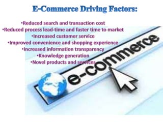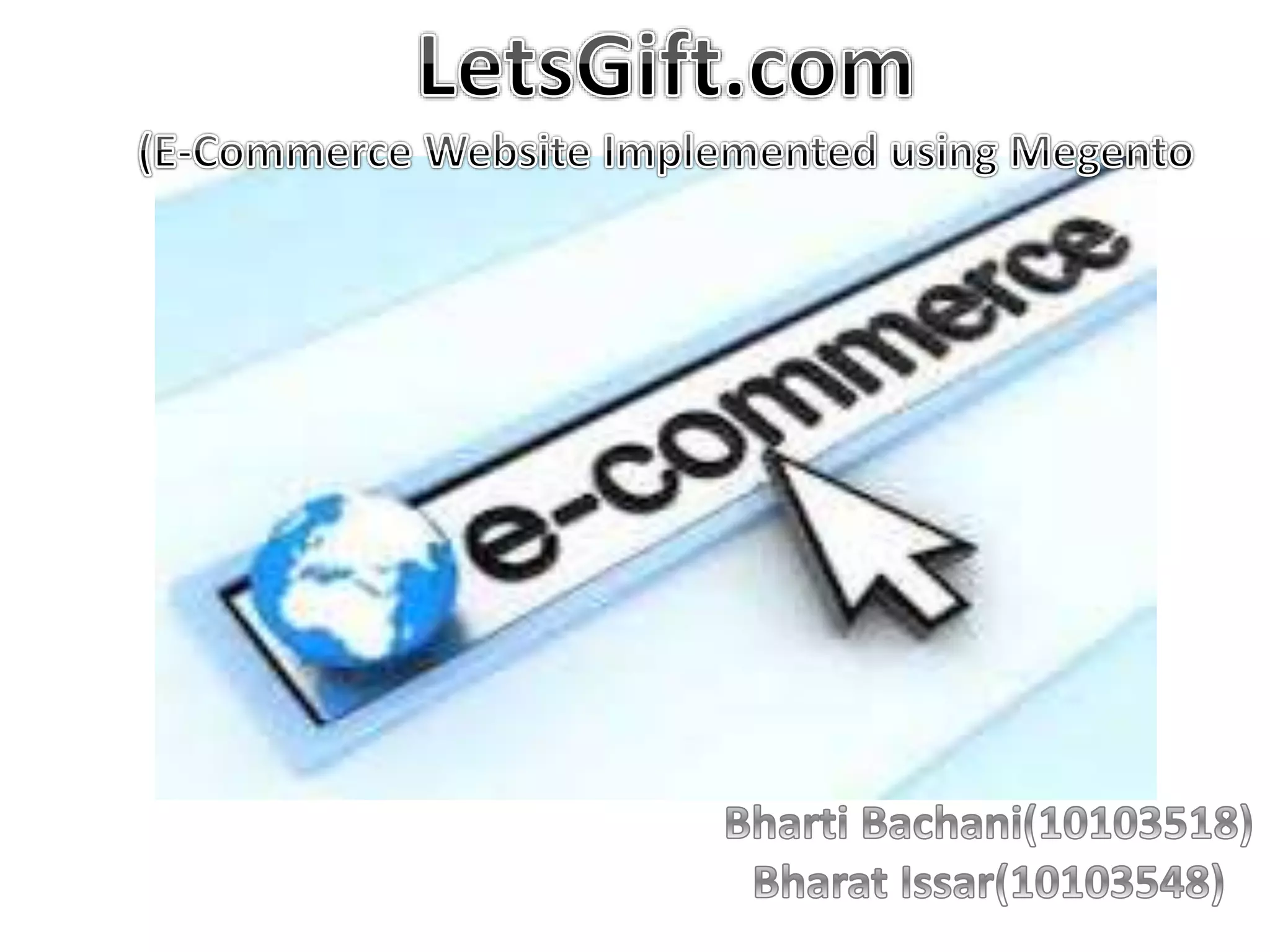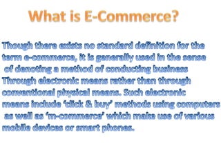 E-commerce can be classified into three main types: C2C (consumer to consumer), B2B (business to business), and B2C (business to consumer). Upcoming trends in e-commerce include increasing internet and mobile penetration in India, selling a wider range of products online, and building customer trust. Magento is an open-source ecommerce platform that offers flexibility and tools to customize online stores. The top ten ecommerce companies in India are Flipkart, eBay India, Snapdeal, Amazon India, Myntra, Shopclues, Dominos, freecharge, Jabong, and Tradus.