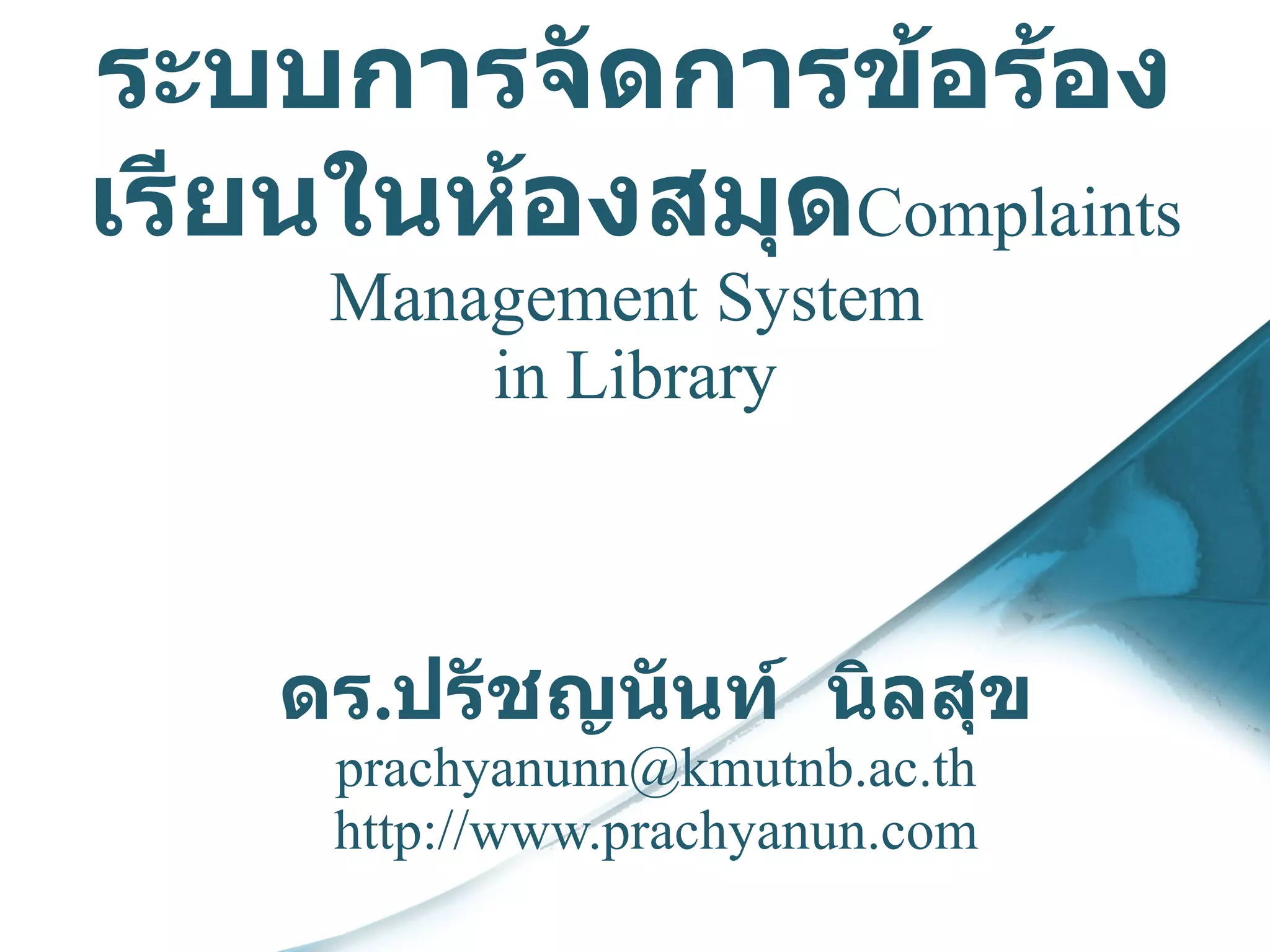 ร้องเรียนในห้องสมุด Complaints Management System in Library ดร . ปรัชญนันท์ นิลสุข [email_address] http://www.prachyanun.com