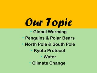 This document discusses global warming and its effects on polar bears, penguins, and the North and South Poles. It also mentions the Kyoto Protocol and climate change. The rest of the document focuses on diesel fuel in Bangladesh, including the price of diesel over the years, its top uses by sector, its inelastic demand, factors that determine its elasticity, what cross elasticity is, and how diesel's cross elasticity would be affected by changes in the price of substitutes like CNG. The document was prepared by three students and thanked their lecturer for English 102.