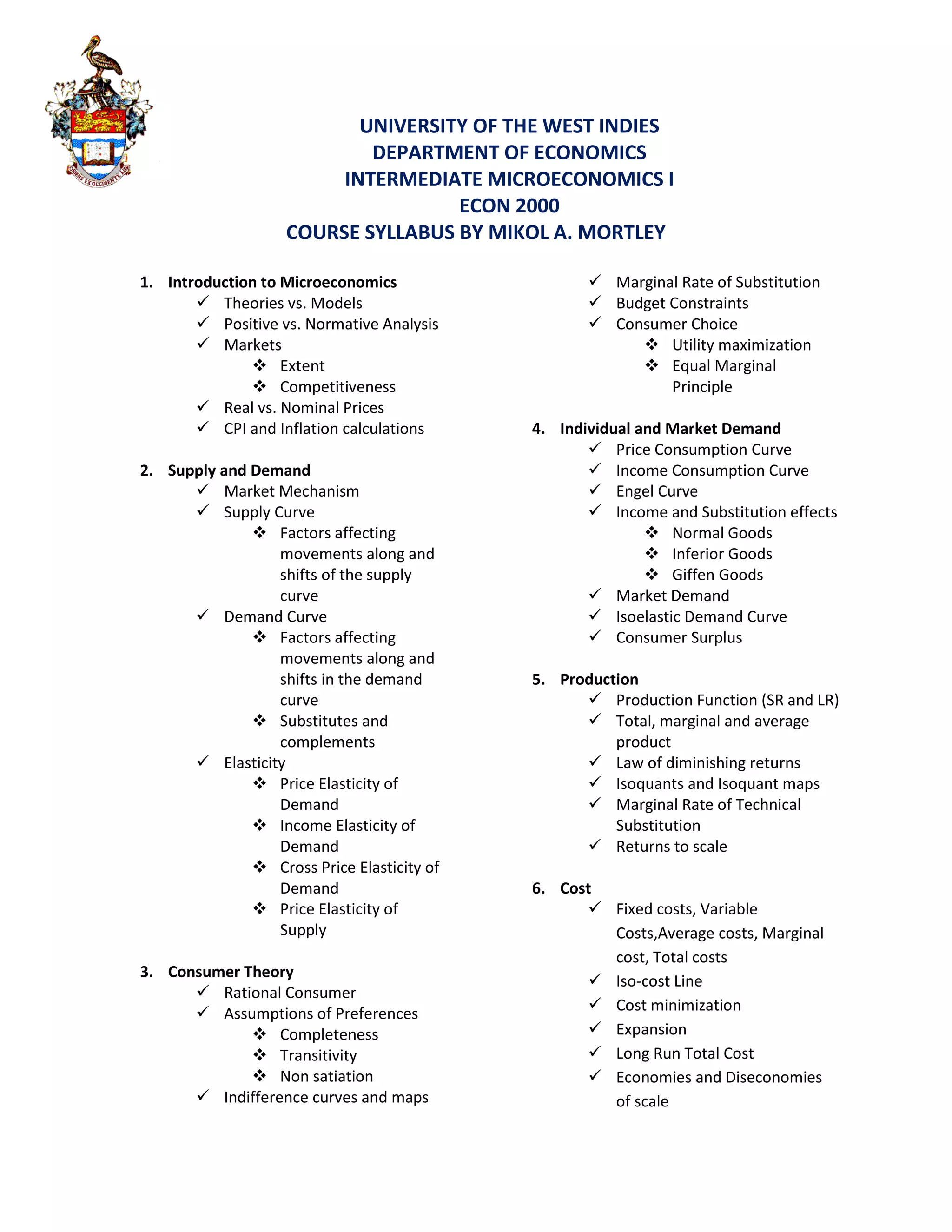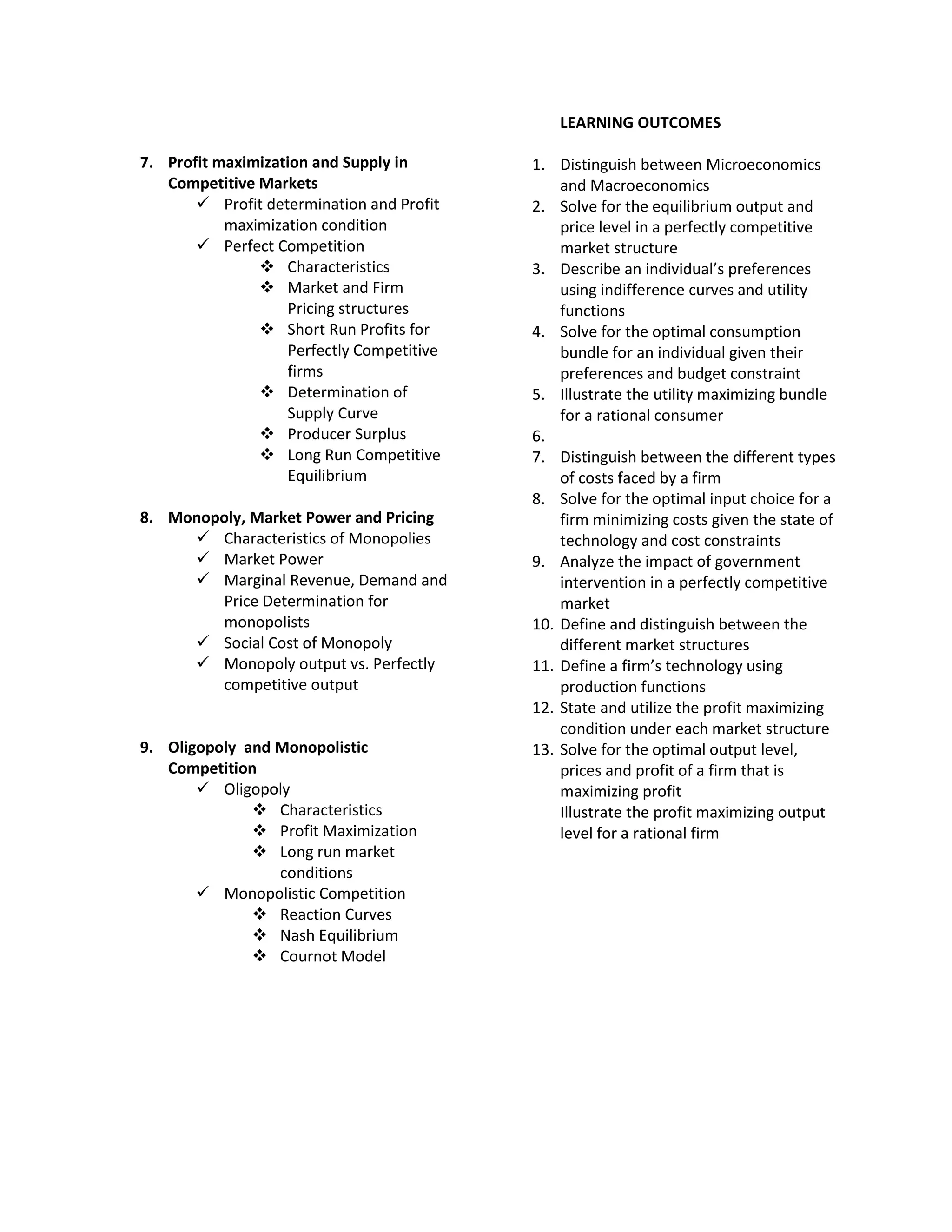 This document outlines the course syllabus for an intermediate microeconomics course. It includes 9 sections that will be covered over the course: 1) Introduction to Microeconomics, 2) Supply and Demand, 3) Consumer Theory, 4) Individual and Market Demand, 5) Production, 6) Cost, 7) Profit Maximization and Supply in Competitive Markets, 8) Monopoly, Market Power and Pricing, and 9) Oligopoly and Monopolistic Competition. The learning outcomes section lists 13 key concepts and skills students should understand by the end of the course, including distinguishing different market structures, solving for equilibrium outcomes, utilizing production functions and profit maximization conditions, and analyzing firm and