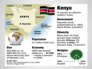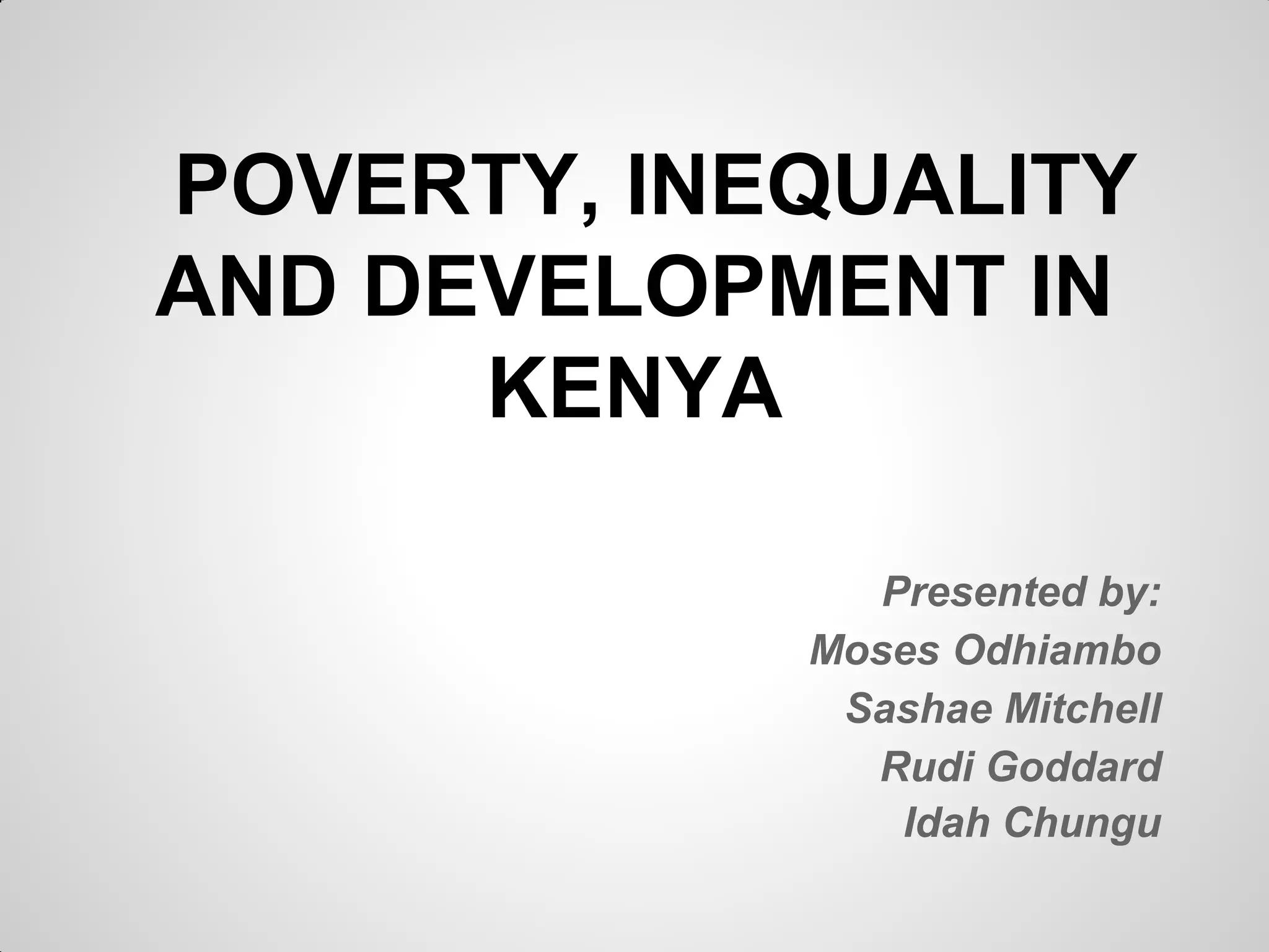 This document summarizes poverty, inequality, and development in Kenya. It provides key statistics showing Kenya is one of the most unequal countries in the world. Over 46% of Kenyans live below the poverty line. Poverty levels vary significantly by ethnicity and region. The document discusses how political structures and divisions have impacted inequality and economic development over time. It concludes by outlining solutions proposed in Kenya's new constitution, such as devolution of power and increased participatory governance, to help reduce poverty and inequality going forward.