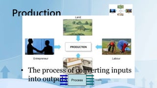 This document discusses key concepts related to production and costs. It defines the four factors of production as land, labor, capital, and entrepreneurship. It explains the differences between short-run and long-run production and explores production functions and schedules. The document also covers total, marginal, and average products as well as the law of diminishing returns. Finally, it discusses different cost concepts including fixed costs, variable costs, total costs, and average and marginal costs.