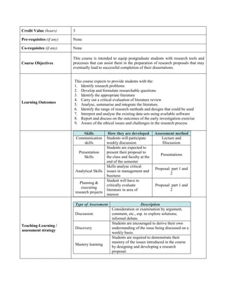 This 3-credit core doctoral course aims to equip students with research tools and processes to prepare successful research proposals. The course covers major steps in research including identifying problems, developing research questions, reviewing literature, analyzing data, and addressing ethical issues. Students will develop and present their research proposals, which will be evaluated based on mastery of course concepts. The course objectives map to the program's learning outcomes in critical thinking, research skills, and awareness of management and business issues.