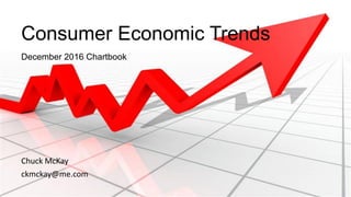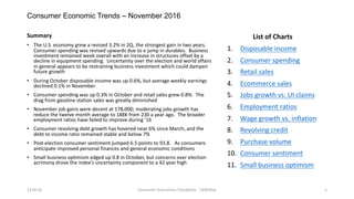The document summarizes consumer economic trends in November 2016. It notes that US GDP grew 3.2% in Q2 2016, the strongest growth in two years. Consumer spending increased in October while average weekly earnings declined in November. Post-election consumer sentiment jumped by 6.5 points as consumers anticipated improved personal finances and economic conditions. Small business optimism edged up in October but concerns over the election drove uncertainty to a 42-year high.