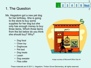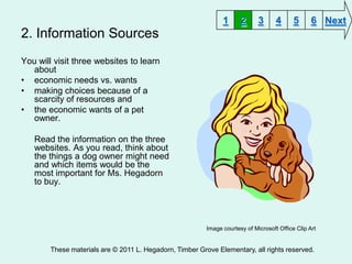 The document describes an activity where students must help Ms. Hegadorn choose three items to purchase for her new dog with limited money. Students are instructed to read three websites about economic needs vs wants, scarcity of resources, and a pet owner's economic wants. They then must write a letter to Ms. Hegadorn recommending three items from a list and explaining why each is needed by a dog owner. The activity aims to teach students about making choices due to limited resources.