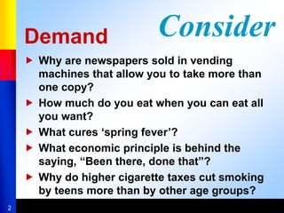 This document discusses the economics of demand. It begins by defining demand and the law of demand, which states that quantity demanded varies inversely with price, assuming other factors remain constant. It then explains the concepts of the demand curve and demand schedule. Individual demand curves can be added together to form a market demand curve. The document also covers elasticity of demand, how it is calculated, and factors that influence elasticity like availability of substitutes. It provides examples of elasticity estimates for different products and concludes by discussing other determinants of demand like income, prices of related goods, and consumer tastes and expectations.