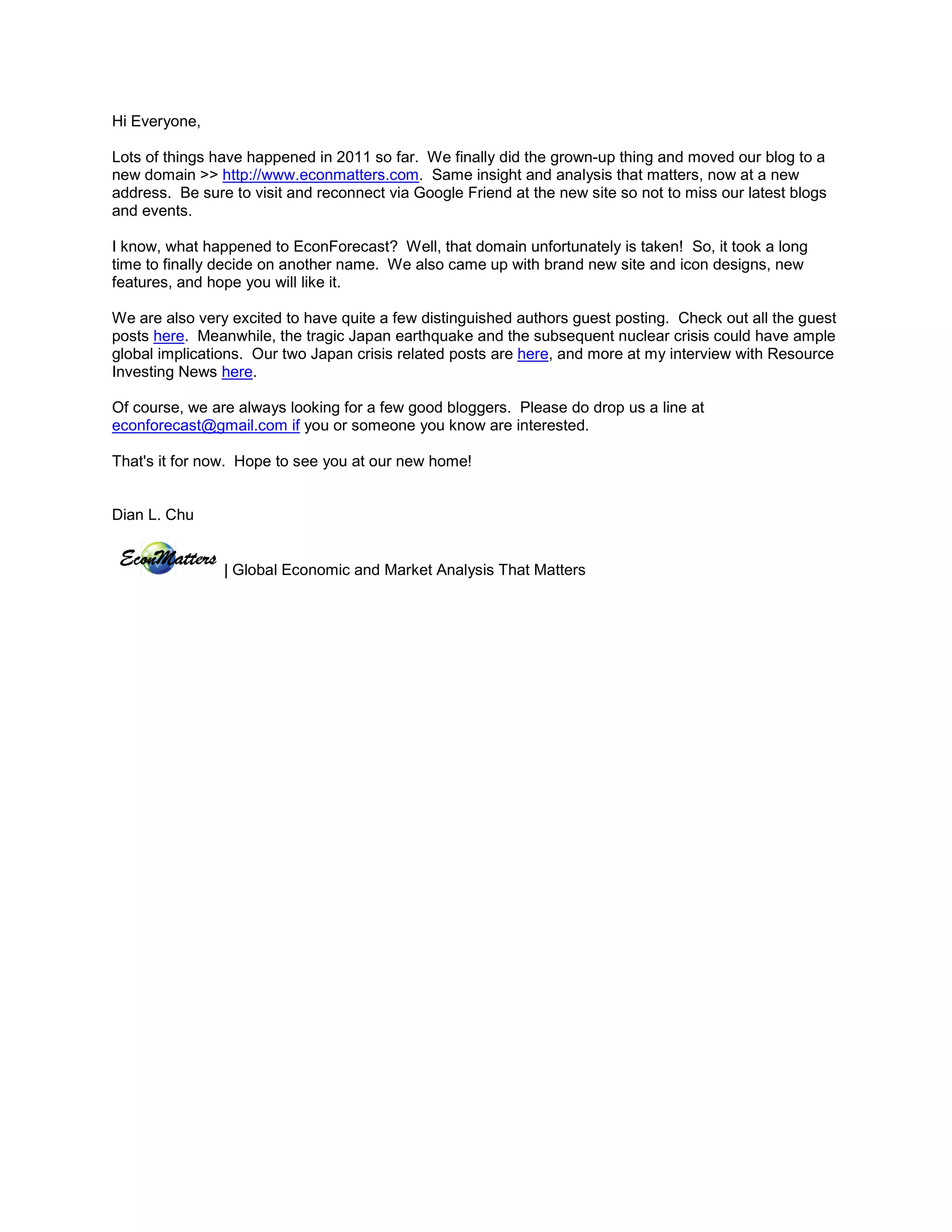 We moved our blog to a new domain, http://www.econmatters.com, with the same analysis but new designs, features, and guest authors. The Japan earthquake and nuclear crisis could have global implications, discussed in two posts on the site. We are looking for new bloggers and hope visitors will connect at the new site.