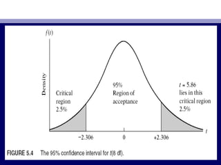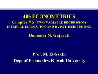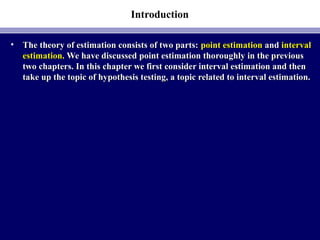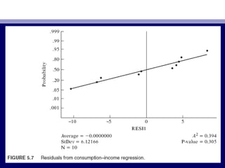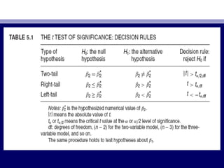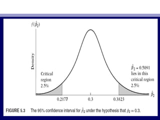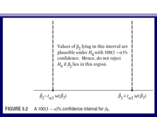This document discusses interval estimation and hypothesis testing for two-variable regression models. It defines a confidence interval as a range of values that has a certain probability, such as 95%, of containing the true unknown parameter value based on the point estimate and its standard error. Formulas are provided for constructing 95% confidence intervals for the regression coefficients based on their point estimates, standard errors, and the t-distribution. An example calculates the 95% confidence intervals for the coefficients in a consumption-income regression model.