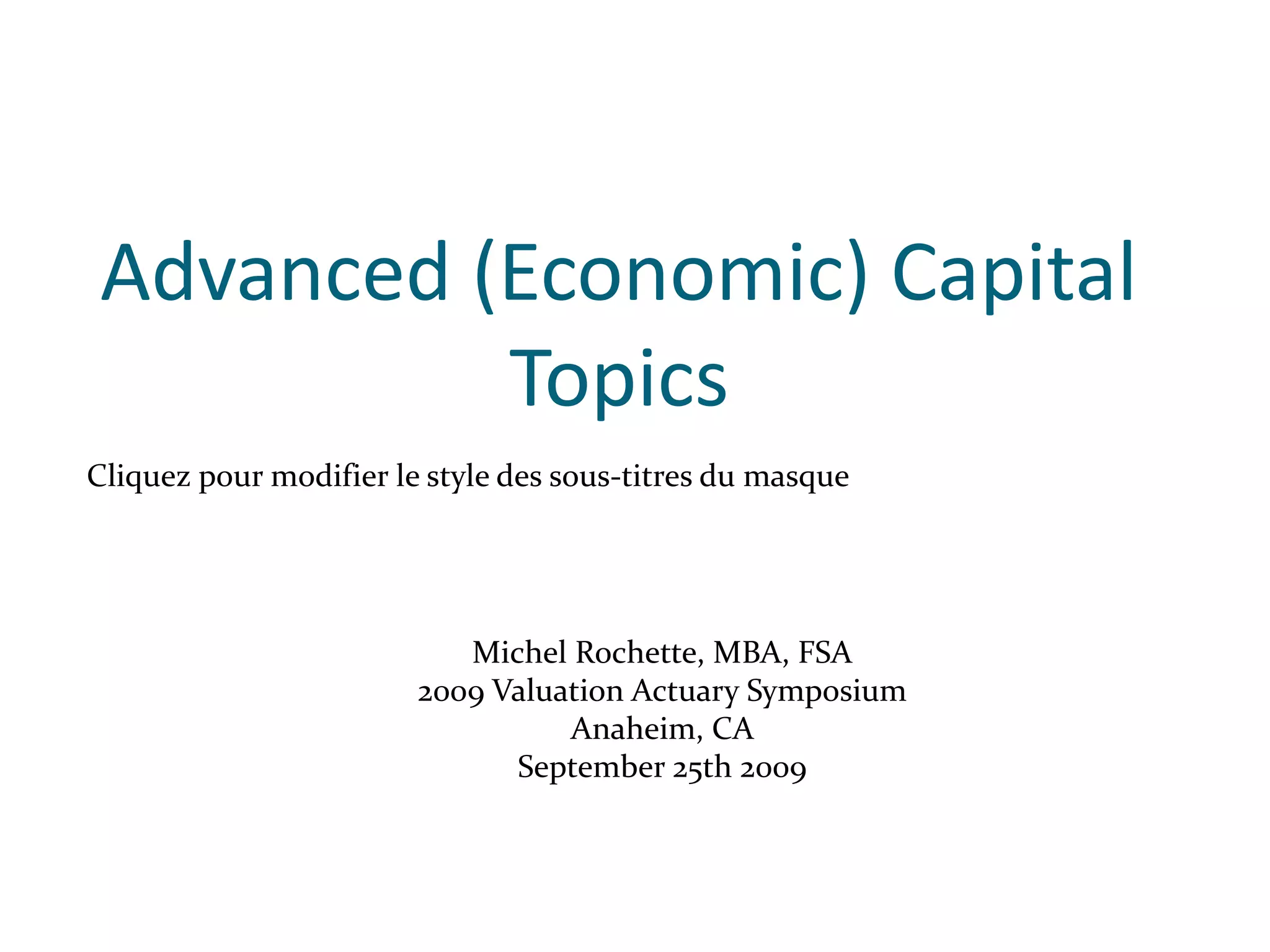 This document discusses topics related to developing an advanced economic capital model. It covers the purpose and principles of capital models, major components, uses of the models, and approaches to building them. Specific topics covered include validation considerations, calibration approaches, modeling correlation in extreme events, and incorporating emerging risks. The overall goal of an economic capital model is to quantify an insurer's risk profile and determine its capital requirements.