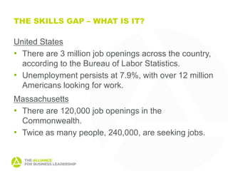 The document discusses the skills gap in the United States and Massachusetts labor markets. There are more job openings than unemployed workers due to a mismatch between the skills employers need and what workers have. This skills gap was caused by changes in educational attainment levels over time. The document recommends actions for government and businesses to address the skills gap, such as reforming education and job training programs, increasing partnerships between employers and educators, and providing more opportunities for on-the-job training and internships.
