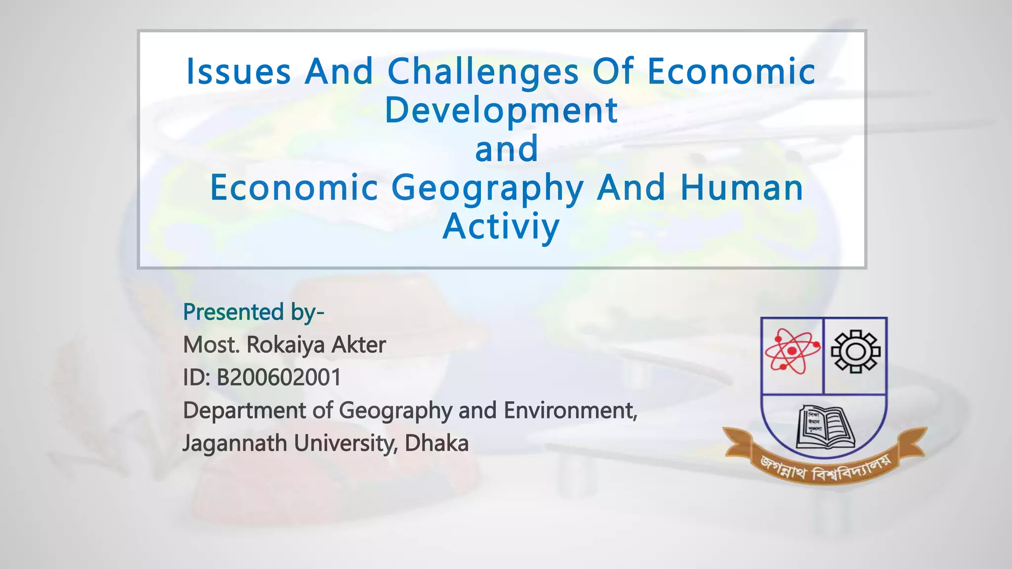 The document outlines various issues and challenges in economic development, including unemployment, poverty, and the effects of globalization, while emphasizing the roles of government and non-government stakeholders. It also addresses economic geography's impact on human activity concerning population growth, resource management, and energy security. Key points include the importance of economic zones and forums for facilitating trade and development, as well as the need for sustainable practices to ensure food and energy security in developing countries.