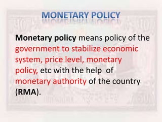 Economic policy refers to actions governments take in economic fields like monetary policy. Monetary policy uses tools like interest rates, cash reserve ratios, and open market operations by a central bank to influence the money supply and stabilize prices. The goals of economic policy are typically full employment, price stability, and economic growth.