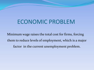 The document discusses the economic implications of minimum wage, arguing that it increases operational costs for firms, leading to reduced employment and higher unemployment rates. It proposes eliminating the minimum wage to enhance U.S. competitiveness, retain jobs, and reduce outsourcing by lowering the costs associated with labor in comparison to foreign countries. The text also highlights the adverse effects of minimum wage on low-skilled workers, suggesting that its abolition would benefit both workers and the economy overall.