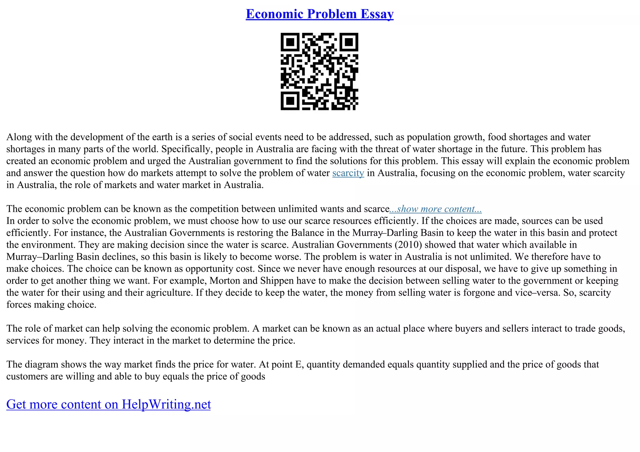 The document discusses the economic problem of water scarcity in Australia and how markets attempt to solve this problem. It explains that water is a scarce resource in Australia, especially in the Murray-Darling Basin. This creates an economic problem and opportunity costs as choices must be made on how to allocate the limited water. The role of markets is then discussed, where the price of water is determined by the interaction of supply and demand. Markets can help solve the economic problem of scarcity by efficiently allocating the scarce water resource.