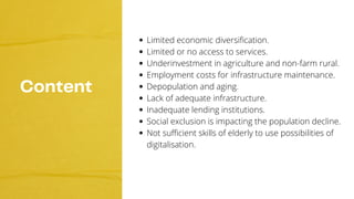 Rural areas in Lithuania face several economic problems including limited economic diversification and access to services, underinvestment in agriculture and non-farm employment, high costs of infrastructure maintenance, depopulation and aging, and lack of adequate infrastructure and lending institutions. These problems stem from a reliance on only a few products or exports, lack of internet access and financial services, insufficient investment in rural development, aging populations moving to cities, and inadequate road networks.