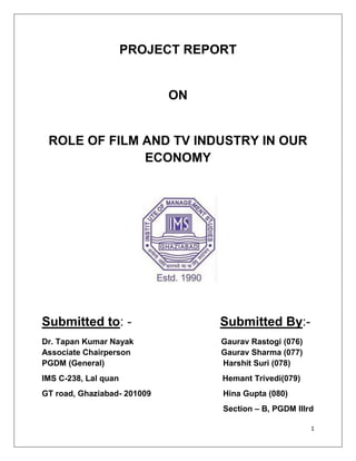 The document is a project report on the role of the film and TV industry in India's economy. It provides background on the film and TV industries in India, including their size, reach, and history. It then discusses the objectives of the study, which are to evaluate the importance, performance, and issues/problems of the industries and how they help other sectors of the economy. Finally, it analyzes the industries' contributions, finding that film contributes Rs. 2,932 crore (USD 645 million) annually to the economy through gross value added and taxes, while TV contributes Rs. 6,497 crore (USD 1,429 million). Both industries employ over 4 million people total.