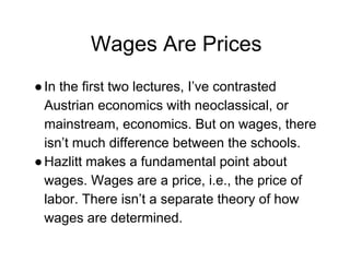 The document discusses the determination of wages through supply and demand, emphasizing that wages are essentially a price for labor, similar to the prices of goods. It explains how employers set wages based on the marginal revenue product of workers and how competitive market dynamics influence labor costs. Additionally, it addresses objections to these concepts and touches on the implications of minimum wage laws and labor unions on employment and wage rates.
