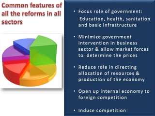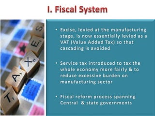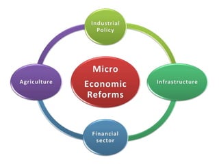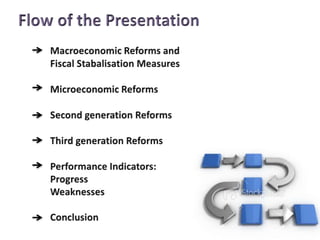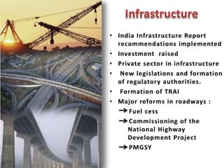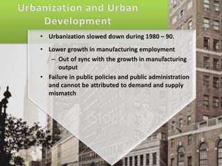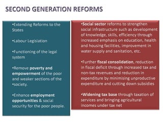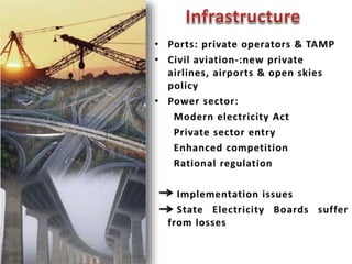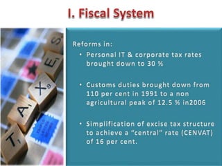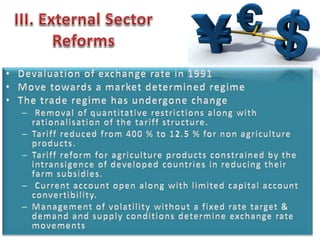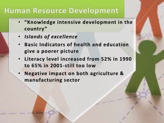 This document contains economic indicators for India from 1989-2003 and socioeconomic indicators for India and other countries from 1951-2005. It shows that India's GDP growth was between 5-8% for the first 40 years and has been around 5% since the late 1990s. Key sectors like agriculture, industry and services have all grown but agriculture growth has slowed in recent years. Poverty and literacy rates improved over time but India still lags countries like China, Bangladesh and Pakistan on socioeconomic measures like life expectancy, infant mortality, access to clean water and sanitation.