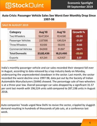The September 2019 Economic Spotlight highlights a severe downturn in India's automobile industry, with sales hitting their lowest levels since 1997-98, leading to massive job cuts. Passenger car sales dropped by 41.09% and overall vehicle sales fell by 15.89% compared to August 2018. This significant decline reflects a broader economic slowdown affecting almost all vehicle segments in the country.