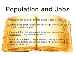 The document summarizes Spain's economic sectors and jobs. It describes how the population is divided into active and inactive groups. It then outlines the three main economic sectors - primary (agriculture, fishing, mining), secondary (industry, construction) and tertiary (services) - and describes some of the key industries and jobs in each sector. The tertiary sector employs the most people in Spain at 65% of the population.
