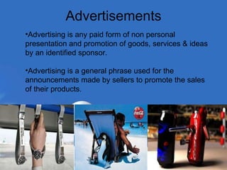 Advertising plays important economic, ethical, and social roles. Economically, it makes consumers aware of products, provides purchase information, and encourages consumption. It differentiates products, builds brand loyalty, and supports media and employment, though it can increase costs. Socially, advertising must follow social norms and risks deception, manipulation, and offending tastes. Ethically, truth and avoiding harm to children are key concerns. Regulators seek fair practices through standards and guidelines.