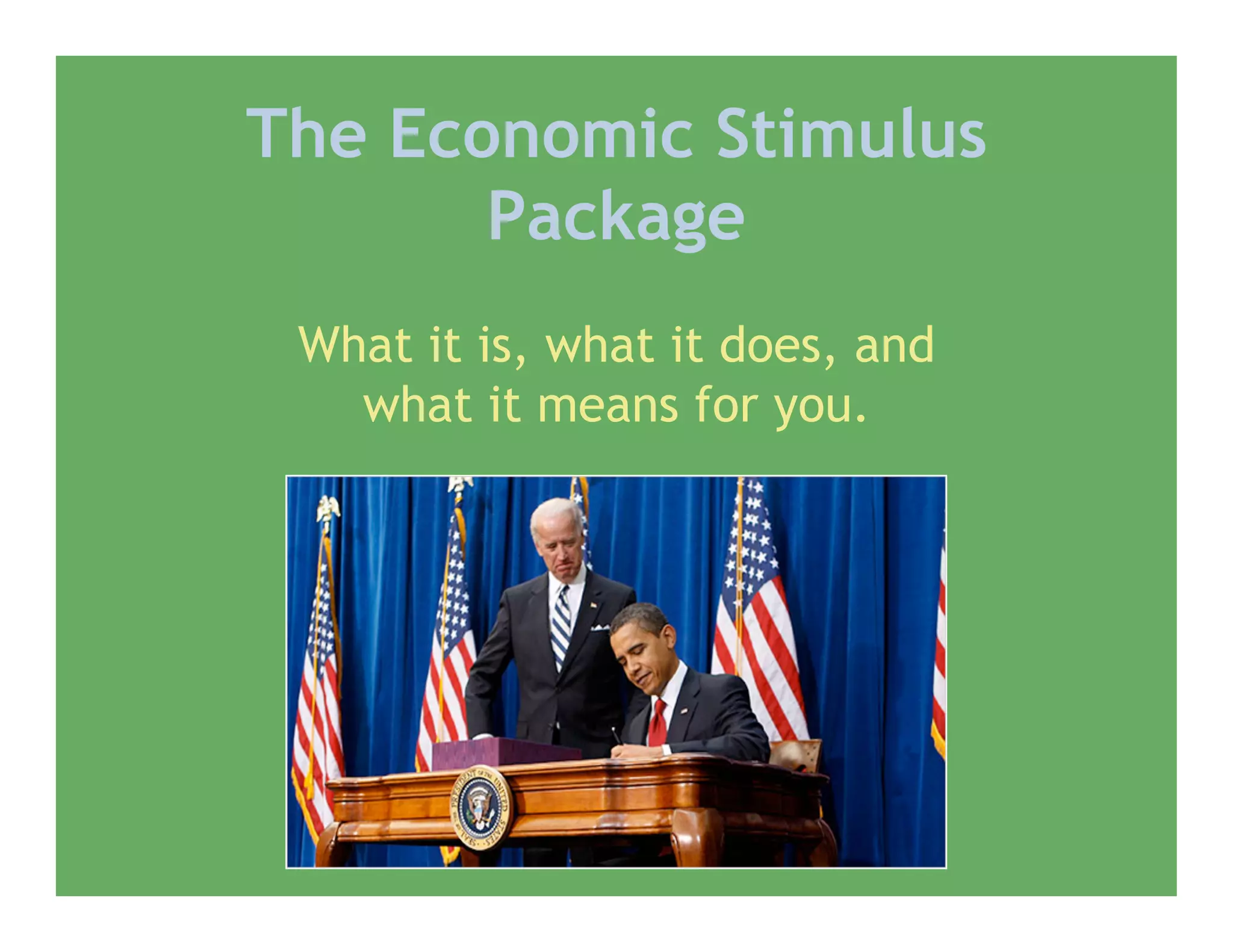 The document discusses the economic stimulus package passed by the US government in response to the recession. It provided both tax cuts and increased government spending, as Democrats favored more spending on infrastructure and industries while Republicans preferred broader tax cuts. The $787 billion package included $70 billion in tax cuts and the rest in new spending. Most economists believe the stimulus would create the most jobs in 2010. The document asks the reader for their opinion on what, if anything, the government should do to improve the economy.
