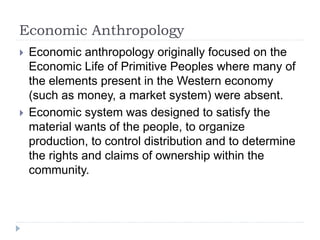 Economic anthropology studies the economic systems of primitive societies where concepts like money and markets are often absent. Production, distribution, circulation and consumption are traditionally divided into four areas of analysis. Anthropologists examine how primitive groups engage in activities like food gathering, agriculture, and handicraft production. Exchange is often based on barter and reciprocal gift-giving rather than markets and currency. Property is collectively rather than privately owned, and cooperation rather than profit is the main motivation for economic activities.