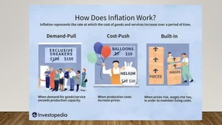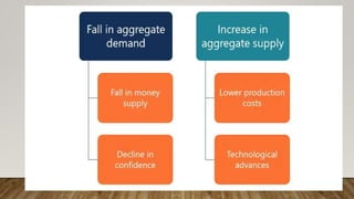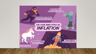 The document discusses inflation and deflation, defining inflation as the increase in general prices of goods and services, and deflation as the decline in these prices. It describes various types of inflation, their causes and effects on the economy, as well as control measures to mitigate their impact. Additionally, it explores the adverse effects of deflation, including increased unemployment and economic downturns, and emphasizes the importance of monetary policy in controlling both phenomena.