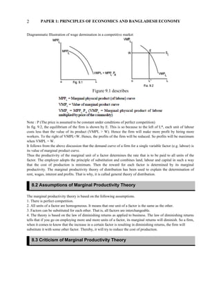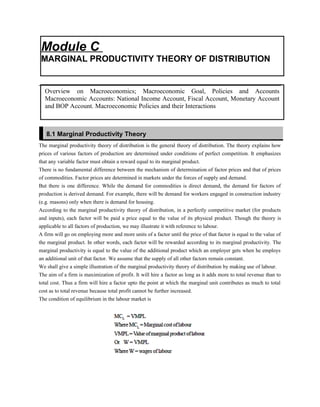 The marginal productivity theory of distribution states that in a competitive market, each factor of production will be paid a price equal to the value of its marginal product. The theory explains that firms will employ factors up to the point where the marginal productivity of the last unit equals its price. Demand for factors is derived from the demand for final goods. The Ricardian theory of rent argues that landowners receive economic rent for more fertile land due to differences in land quality and scarcity of the best land. Rent is a surplus over the costs of cultivating the least fertile land.