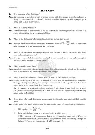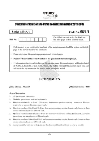 The document provides instructions for students appearing for CBSE Board Examinations 2011-2012. It mentions that the code number on the question paper should be written on the answer booklet. It also notes that the paper contains 8 printed pages and students have 15 minutes to read the paper before writing answers. The paper then provides instructions and questions for the Economics exam, including short answer questions worth 1-4 marks and long answer questions worth 6 marks.