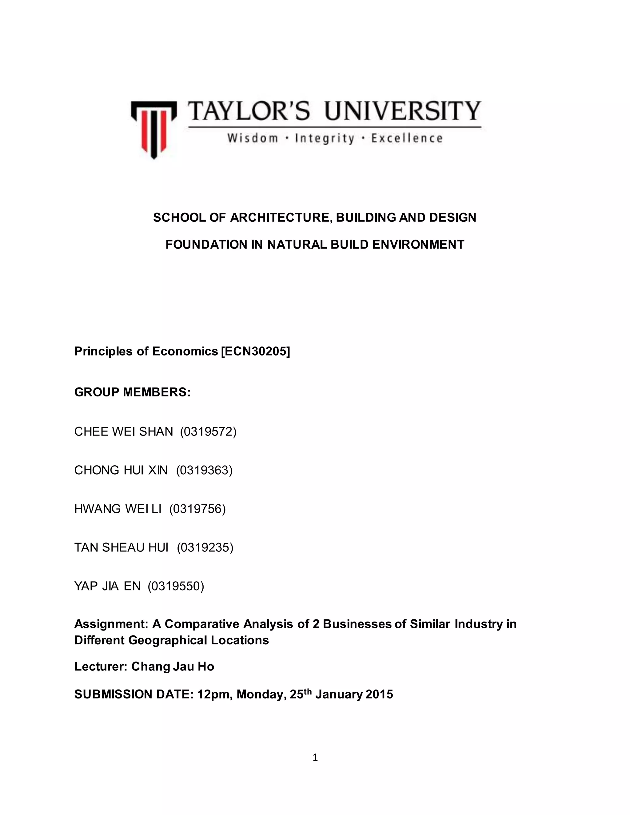 This document provides an analysis and comparison of two hardware businesses located in different geographical areas of Malaysia. The first business, Perniagaan Gluck, is located in Subang Jaya, Selangor and was founded in 2000. The second business, Cemerlang Indah Hardware, is located in Port Dickson, Negeri Sembilan and was founded in 1984. The analysis compares the businesses' histories, products, customers, competitors, strategies, and development. It concludes that Perniagaan Gluck has a higher potential for success due to its innovative strategies and future plans, such as developing an online presence, while Cemerlang Indah Hardware takes a more traditional approach. Recommendations