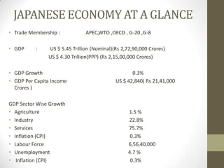 The document provides an overview of the Japanese economy. It notes that Japan has a GDP of $5.45 trillion nominal and $4.3 trillion PPP, with GDP growth of 0.3%. Services make up 75.7% of GDP. Exports total $756.2 billion with main partners being China and the US, while imports total $636.8 billion mainly from China and the US. Public debt is 225.8% of GDP, the highest in the world. Major industries are dominated by a few large conglomerates. The government plays an active role in the economy through various ministries and policies.