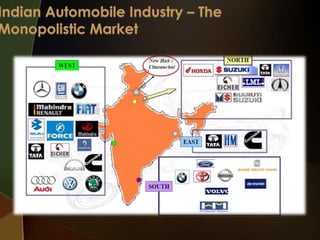 The document traces the history of automobiles from the first steam-powered vehicle created in 1769 to the introduction of gasoline-powered internal combustion engines in 1885. It then discusses the growth of the automobile industry in India, starting with a few domestic manufacturers in the 1940s and experiencing rapid growth after economic liberalization in the 1990s, which attracted many global automakers to set up assembly operations in India. The industry now contributes significantly to India's GDP and employment.