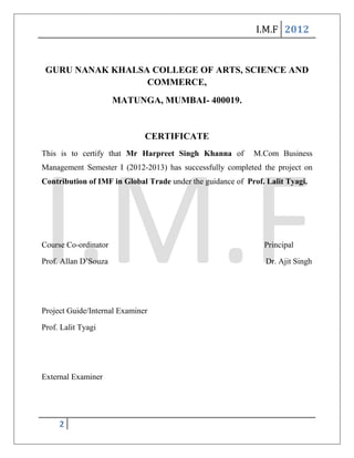 This document is a project report submitted by Harpreet Singh Khanna for his Master of Commerce degree in Business Management at Guru Nanak Khalsa College of Arts, Science and Commerce in Mumbai, India. The report provides an introduction to the International Monetary Fund (IMF), including its history, role, activities, and contributions to global trade. It covers topics such as the IMF's response to financial crises, its technical assistance programs, how it lends money to countries, and discusses its use of gold and Special Drawing Rights in the global financial system.