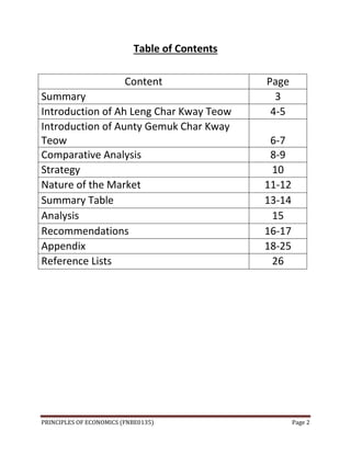 This document contains a report on a comparative analysis of two char kway teow businesses located in different areas. The report includes introductions of each business outlining their history, location, operations and competitors. A comparative analysis is presented, noting the Ah Leng business in Penang faces more competition than Aunty Gemuk in Petaling Jaya. Both businesses are found to employ a publicity strategy rather than direct competition. The nature of the char kway teow market is determined to be oligopolistic with many similar businesses.