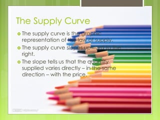 The document discusses the law of supply, which states that the quantity supplied of a good rises as the price rises and falls as the price falls, assuming other factors remain constant. It explains that individuals supply factors of production to firms and that firms then transform these inputs into usable goods and services. The supply curve illustrates the relationship between price and quantity supplied, and can shift due to changes in input prices, technology, expectations, taxes, or subsidies.