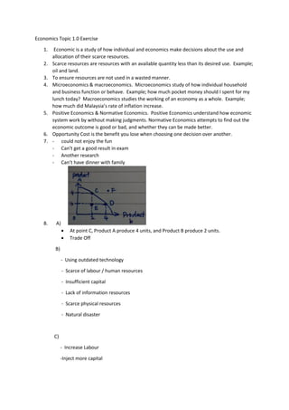 1) Economics studies how individuals and societies make decisions about scarce resources.