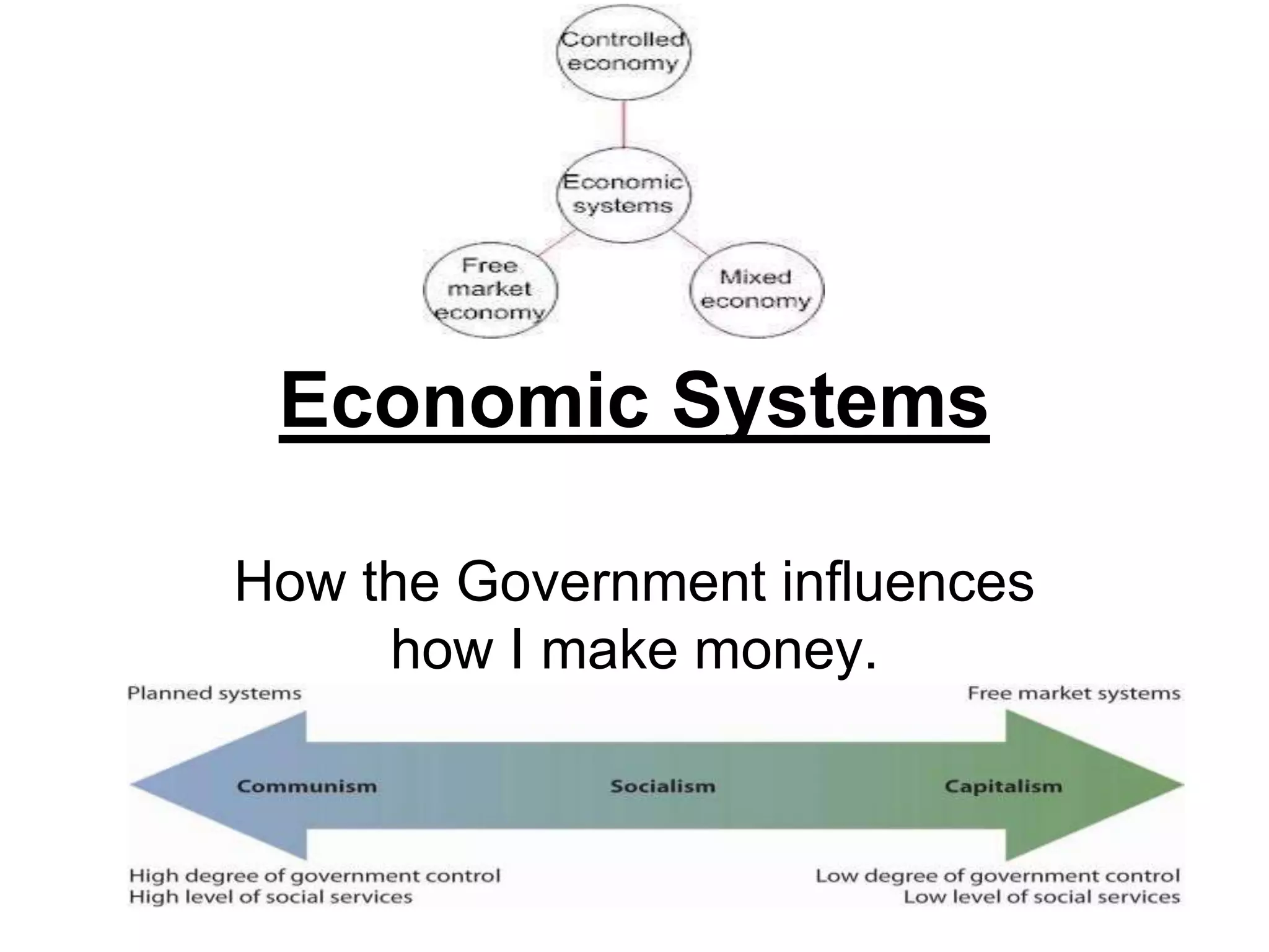 This document discusses different types of economic systems and how they answer key economic questions. It outlines three main types: traditional economies where customs dictate production and distribution, command economies where the government controls economic decisions, and free market economies where individuals and businesses have freedom to produce and trade. It also notes that most modern economies are mixed, blending elements of different systems. For example, the US has a predominantly free market economy but the government also regulates businesses and provides social services.