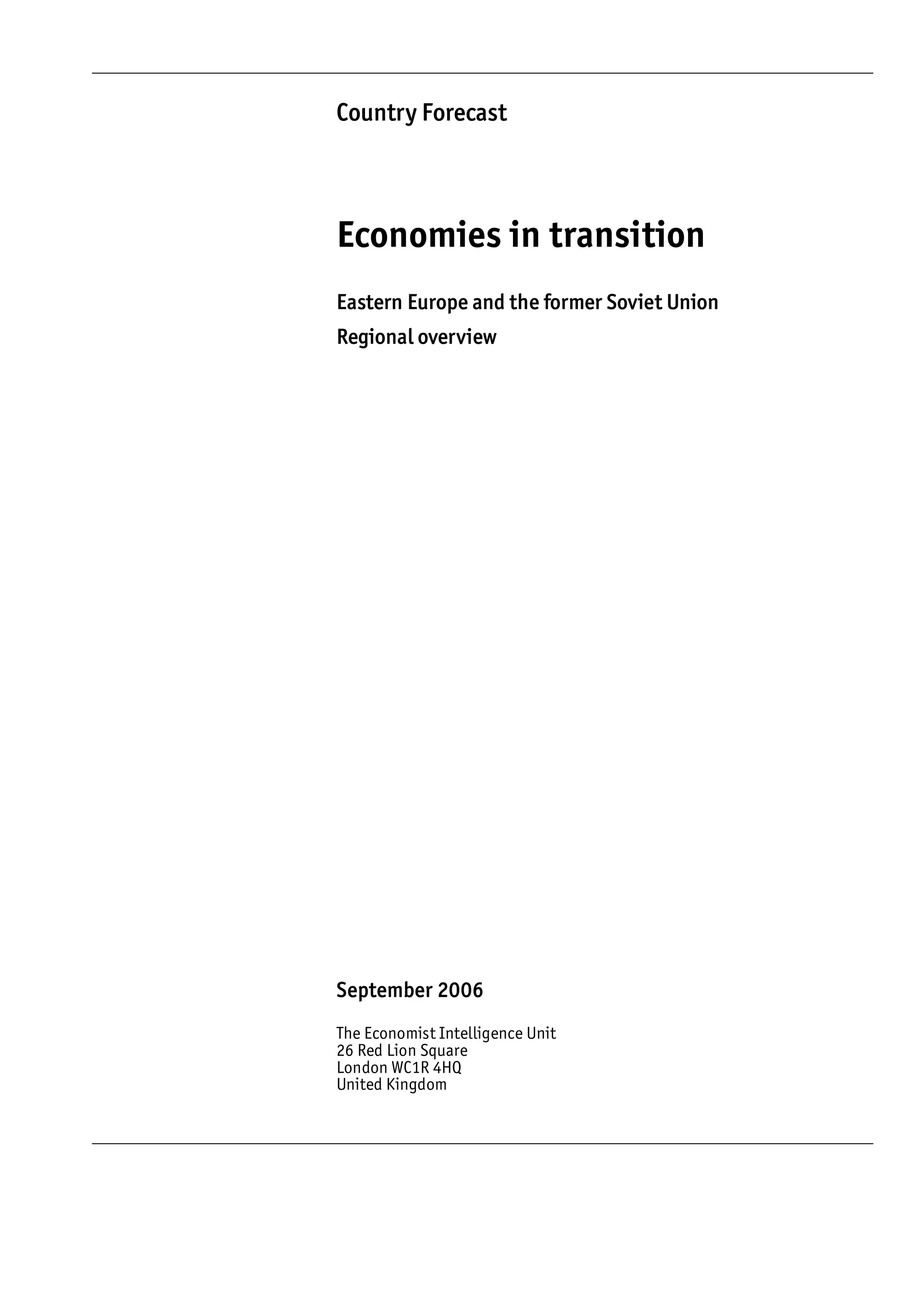 The document provides a regional overview of economies in transition in Eastern Europe and the former Soviet Union, highlighting the contributions of financial sector development to economic growth. Despite political uncertainties, the economic outlook is favorable, with projected growth rates above 5% for the period of 2006-2010. It notes that foreign direct investment inflows and improvements in business environments are expected, although risks remain related to slow reforms and financial stability.
