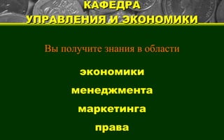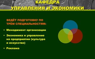 Кафедра управления и экономики предлагает обучение по трём специальностям: менеджмент организации, экономика и управление на предприятии, реклама. Студенты получают знания в области экономики, менеджмента, маркетинга и права, с акцентом на инновации и социально-культурную сферу. Выпускники могут занимать руководящие должности и имеют возможность обучаться в творческой атмосфере, с акцентом на научно-практическое применение своих знаний.