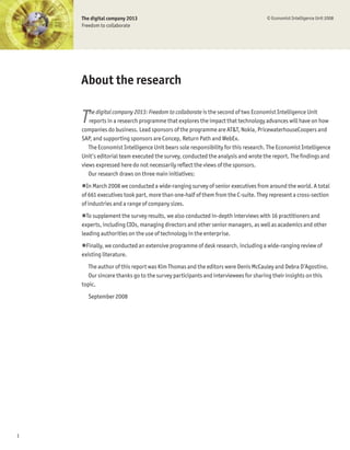 The 'Digital Company 2013: Freedom to Collaborate' report from the Economist Intelligence Unit examines how technological advances will reshape business practices over the next five years. Key findings include the rise of collaboration technologies, the shift towards decentralized IT structures, and the need for companies to adapt to a more autonomous workforce that expects to use technology freely. Overall, firms will need to embrace these changes to harness the productive energy generated by collaboration for business benefits.