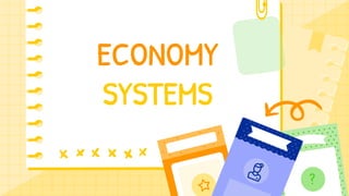 The document discusses different economic systems throughout history including primitive economies, slavery, feudalism, mercantilism, capitalism, communism, and mixed economies. It provides details on key aspects of each system such as dominant economic activities, production and distribution structures, and social classes. For example, it notes that primitive economies involved simple cooperativism for mutual benefit within clans/tribes and there was no exploitation or social classes. Slavery economies were based on agricultural production using exploited slave labor with social relationships founded on property rights over people.