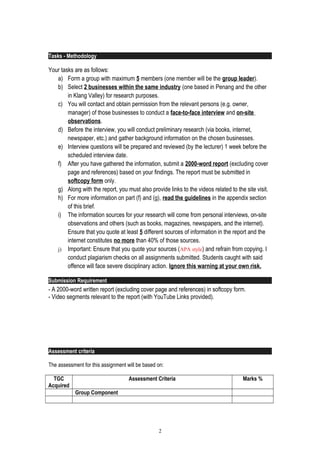 This document provides guidelines and instructions for a group assignment comparing two businesses in different geographical locations. Students must form groups, select two businesses (one in Penang and one in Klang Valley) in the same industry, conduct interviews and on-site observations of the businesses. They must then submit a 2000-word written report analyzing and comparing the competitive behaviors and traits of the two businesses, along with video links. The report will be assessed based on spelling/grammar, background information provided, analysis of competitive behavior, and video segments. Detailed requirements and assessment criteria are provided.