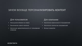 Документ обсуждает различные модели рекомендации контента, включая коллаборативные и контентные подходы. Он подчеркивает, что классические системы рекомендаций лучше работают с текущими пользователями и что персонализированные рекламные сообщения могут значительно увеличить охват. Кроме того, говорится о высокой эффективности персонализированной рекламы по сравнению с традиционными методами.