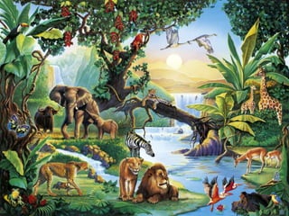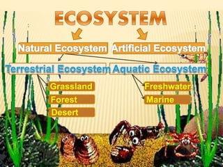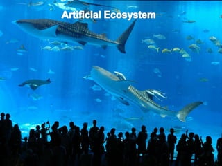An ecosystem is defined as a biological community of interacting organisms and their physical environment. It includes both biotic factors such as plants, animals, fungi and bacteria, as well as abiotic nonliving factors like climate, soil and rocks. Within an ecosystem, organisms live in a habitat and often have symbiotic relationships where they live closely and benefit from one another.