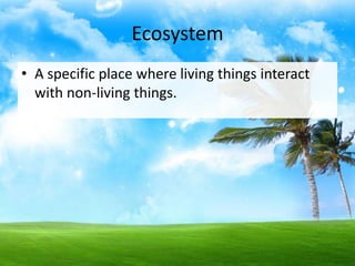 An ecosystem is a specific place where living and non-living things interact. It has biotic factors like organisms and abiotic factors like air, water, and soil. Mutualism benefits both organisms, while commensalism benefits one organism without affecting the other. Parasitism harms one organism and benefits the other, as ectoparasites live outside and endoparasites live inside the host. Competition occurs when multiple organisms utilize the same limited resources, and predation benefits the predator through consuming its prey.