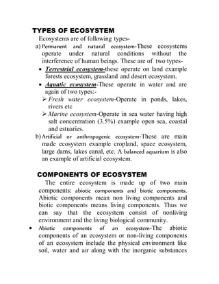 An ecosystem consists of biotic and abiotic components that interact and depend on one another. The biotic components include producers, consumers, and decomposers. Producers such as plants harness energy from the sun through photosynthesis to produce organic compounds, which consumers like herbivores and carnivores feed on directly or indirectly. Decomposers break down dead organic matter and cycle nutrients back into the environment. Energy flows through the ecosystem as organisms consume other organisms. Nutrients also cycle through biogeochemical cycles as organisms uptake and release elements like carbon and phosphorus. A balanced ecosystem maintains stable populations through interconnected food chains and limits the destruction of any component.