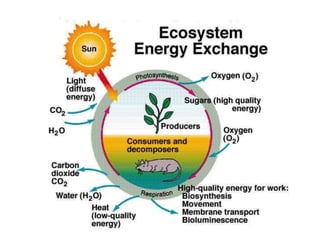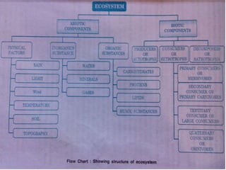 2. It describes the key components of an ecosystem as biotic factors (living organisms) and abiotic factors (non-living physical components).
