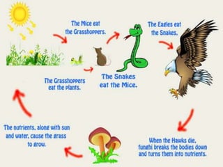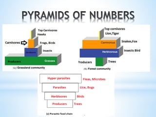3. Energy flows through ecosystems via food chains and food webs with plants at the base converting solar energy to chemical energy which is then transferred between trophic levels.